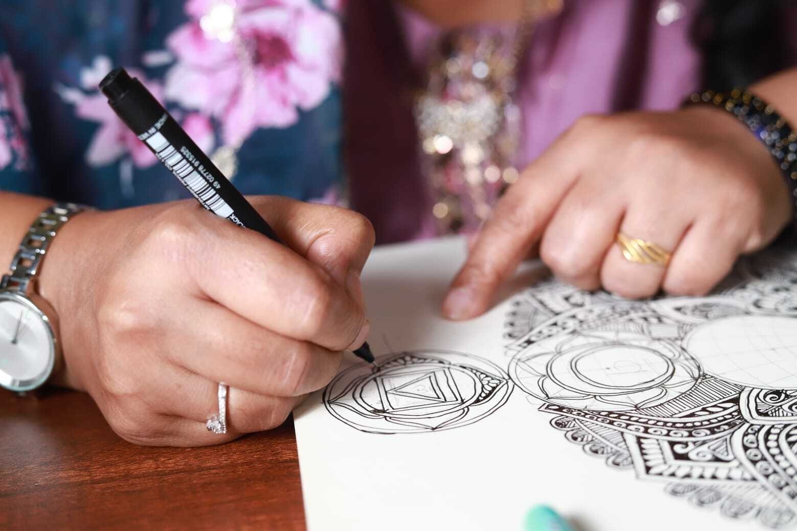 We use Mandala, Calligraphy, Journaling, and mindful creation as tools for emotional release and clarity.